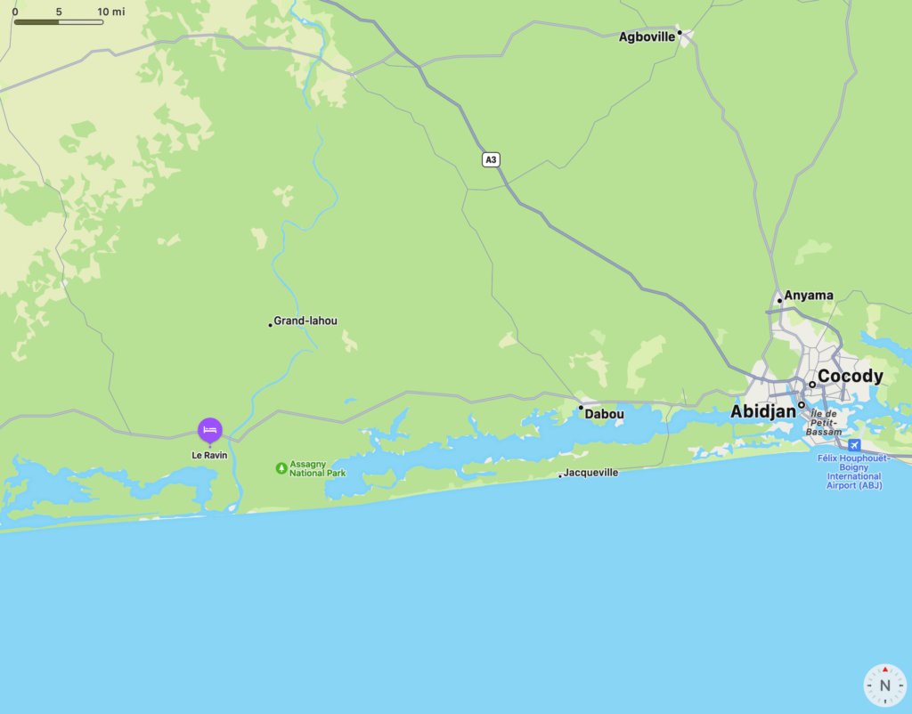 Vous serez alors sur la Côtière. Vous traverserez Irobo après 50 km. Grand-Lahou est alors a 25 km. Arrivé à l intersection allez à gauche. Vous passez le commissariat de police à droite, et, à la statue allez à droite, tout droit, et à environ 1km, passez la mairie à gauche, à environ 100m, prenez un tournant en epingle à cheveux à gauche (Ne sortez pas de l’agglomeration .) Tournez presque immédiatement dans un chemin de terre à droite. Nous sommes situés au bout du chemin en Cul de sac. Portail vert et jaune. Vous êtes arrivé.